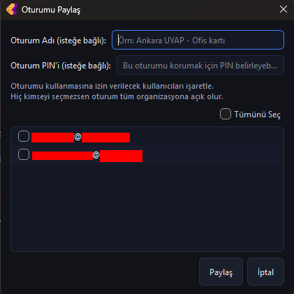 Oturum açıldıktan sonra “Oturumu Paylaş” butonuna basarak haihazırda oluşturduğunuz oturumu Kuruluş’taki diğer kullanıcılar ile paylaşabilirsiniz.